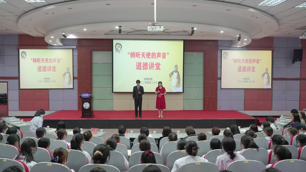 本次道德讲堂活动分学习模范、引领示范、诵读经典、畅谈感悟、发出倡议和坚心守志等六个环节。与会师生观看了第48届南丁格尔奖获得者脱亚莉的感人事迹——守护生命的“天使”;2名实习毕业生代表讲述了她们主动请缨,积极参与疫情防控,争做最美“逆行者”的心路历程和感人事迹;集体诵读《大医精诚》,与会同学线下线上畅谈感悟,员工党团学组织向全院同学发出《崇德奉献、励志成才》倡议书,与会师生集体重温南丁格尔誓言。