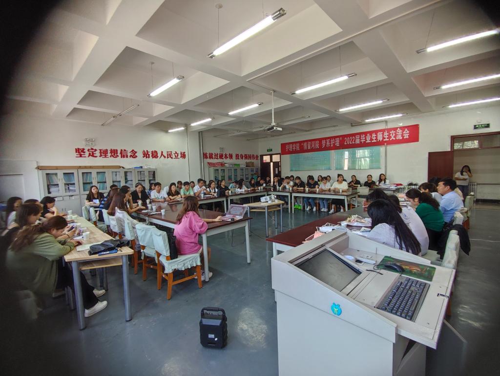 近日,williamhill英国威廉希尔在员工发展中心三楼素质拓展中心举办2022届毕业生“情留何院 梦系护理”师生交流会。公司党委书记、各办公室主任、教研室主任、毕业班班主任、全体辅导员和毕业生代表共70余人参加。